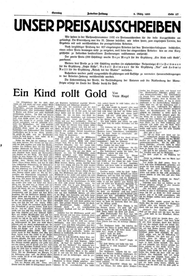 Finally, we can wish the esteemed as well as successful journalist and writer Else Feldmann continued success in her future work, and we are very much looking forward to her new serial novel Martha und Antonia (‘Martha and Antonia’), which will be published in the Arbeiter-Zeitung starting this fall.