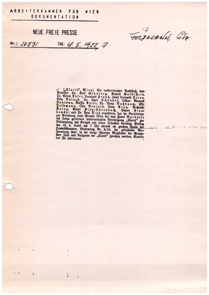 Another important aspect of Else Feldmann’s life is her promotion of lively exchange among committed writers. At the age of 38, she was a founding member of the Austrian faction of the French association Clarté, an association of intellectuals founded in 1919 by Henri Barbusse and Romain Rolland to fight against war. Earlier this year, she and other authors founded the Association of Socialist Writers,in order to give all authors with a socialist worldview a place where they can exchange views, as well as promote themselves intellectually and materially, making evenings such as this one possible.