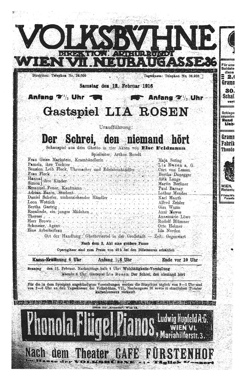 On 12 February 1916, her only fully preserved play, Der Schrei, den niemand hört. Trauerspiel aus dem Ghetto (‘The Cry That No One Hears: A Tragedy from the Ghetto’), premiered at the Volksbühne in Vienna. For this performance, Lia Rosen, a former Burgtheater actress, was engaged from Berlin. Two other plays, Jazzmusik: Ballett der Straße (‘Jazz Music: Ballet of the Street’) and Der Mantel (‘The Coat’), are only fragmentarily preserved. In 1921, her best-known novel, Löwenzahn. Eine Kindheit (‘Dandelion: A Childhood’), was published by Wiener Rikola Verlag.