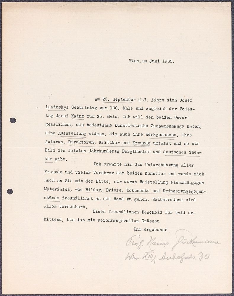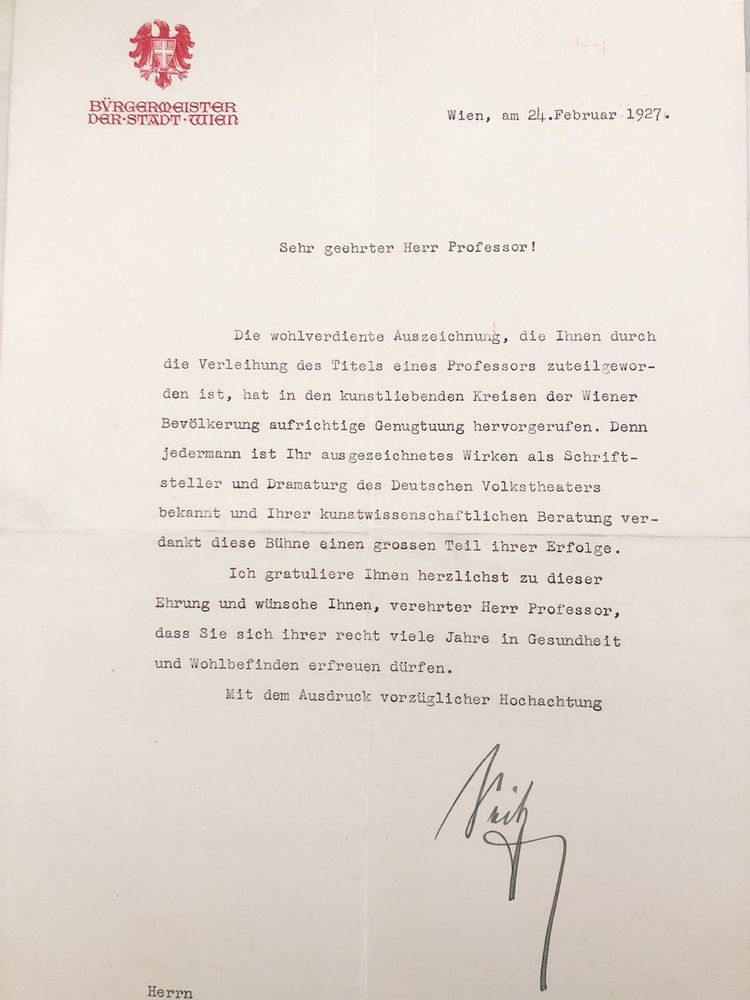 The Anschluss in March 1938 had profound consequences for Heinrich Glücksmann. That year, among other hardships, the Glücksmann family was evicted from their apartment on Auhofstraße. Many of Glücksmann’s colleagues left Vienna and emigrated to other countries, including his youngest son Hans Karl and his family, who fled to Argentina via Great Britain in 1939. Glücksmann and his wife Helene could only join them in 1941. There is little information about their escape. Heinrich Glücksmann passed away at the age of 79 on 1 March 1943, in exile in Buenos Aires. Despite his extensive body of work, his significant influence, and his importance in the world of theatre at the time, Heinrich Glücksmann is scarcely remembered today. The only traces of Glücksmann that remain can be found in the correspondences and old newspaper articles preserved in archives.