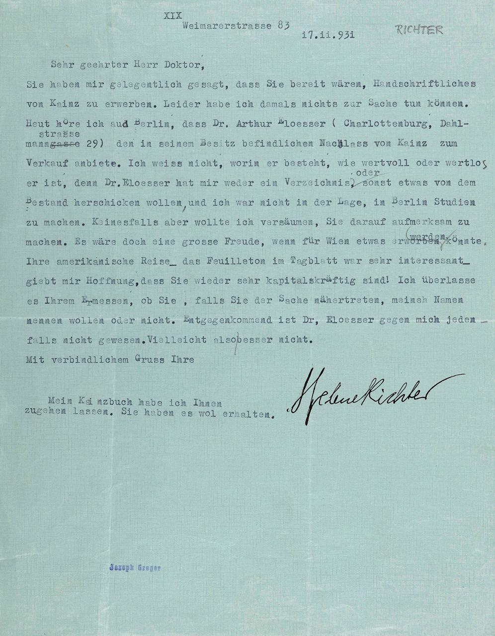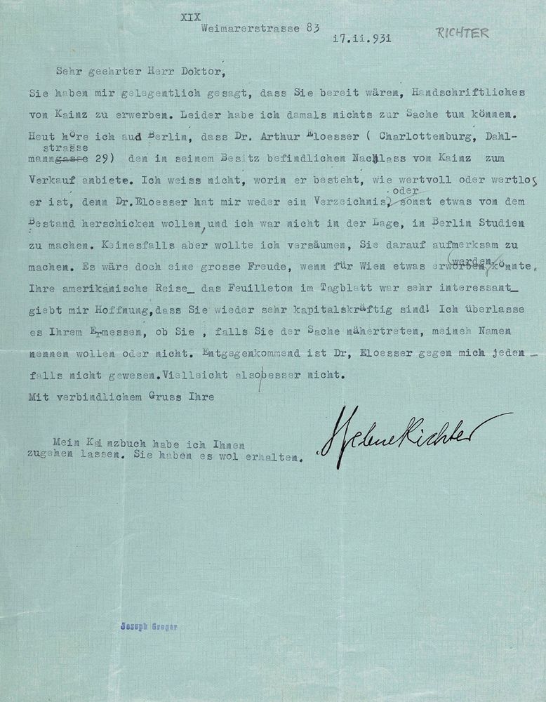 As early as November 1938, both of the Richter sisters were pushed out of their professional lives due to being Jewish and, having no source of income, had to sell parts of their library. Moreover, the elderly sisters declined the support of the International Federation of University Women with the argument that ‘you don’t transplant old trees’. Thus, they did everything in their power, despite being isolated and harassed, to remain in their beloved Vienna. Consequently, they sold 100 of the most valuable books from their library to pay the ‘wealth tax’. However, no payment was made to the Richter sisters after they sent the works to the library in Cologne. ‘It was the first hearse that took them away’, Elise Richter wrote in her first letter to the library on 24 August 1941.
